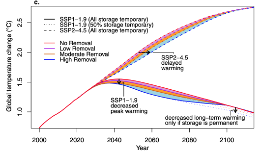 将来の緩和努力にこのレベルの厳しさがない場合(SSP2-4.5)、NbSに基づく一時的な炭素貯留は、ピーク温暖化に影響を与えず、ある温暖化レベルの発生を遅らせるだけで、長期的な気候ベネフィットはない。
