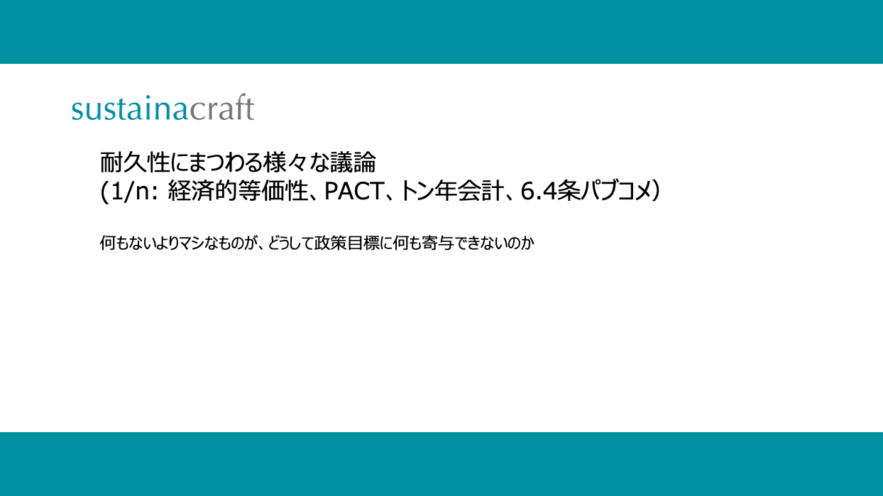 耐久性に関する様々な議論(1/n: 経済的等価性、PACT、トン年会計、6.4条パブコメ)