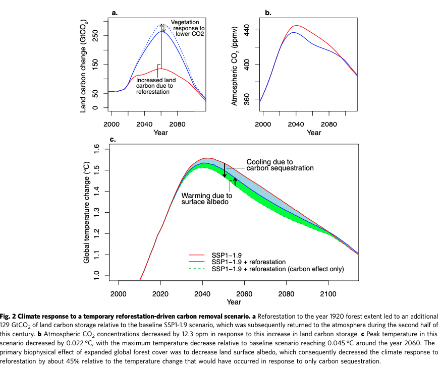 文献[3]の”Temporary nature-based carbon removal can lower peak warming in a well-below 2 °C scenario”も、この記事と同じ文脈でNbSによる一時的な炭素吸収の貢献を定量的に評価した研究結果です。ここではアルベドの影響も含めて分析をされてますので、概要と合わせて紹介します。