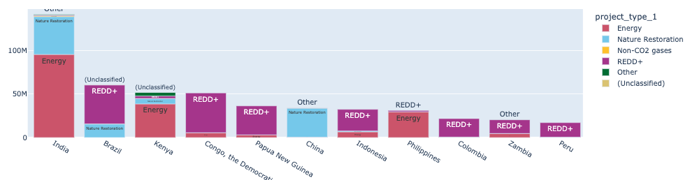 まだ最終承認を得られていないVCS/Gold Standardについては、「方法論」と「相当調整」の2点が供給ポテンシャルを見極める上で重要になります。どちらもまだ確定的なことは言えませんが、見通しを考える上で、以下のグラフが重要です(VCS及びGSの合計について、供給見込みが上位国のみを表示しています)。ここではIC-VCMのCCP(Core Carbon Principle)の審査状況を踏まえて、CORSIA適格になる可能性が相応に高いと想定される方法論を用いた既存パイプライン案件からの年間創出量見込みをもとにしています。詳細な説明は下部にて実施します。