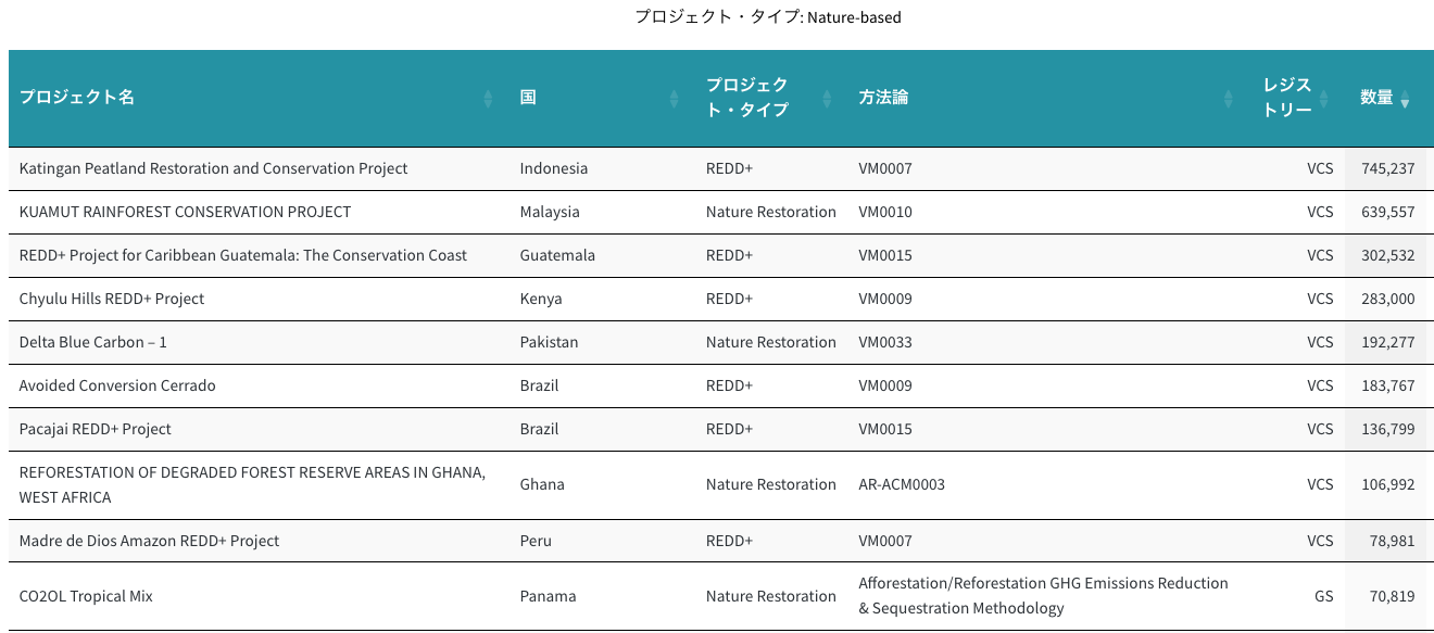 本対象期間に最も多く償却されたトップ10の自然由来プロジェクトの一覧は以下の通りです。