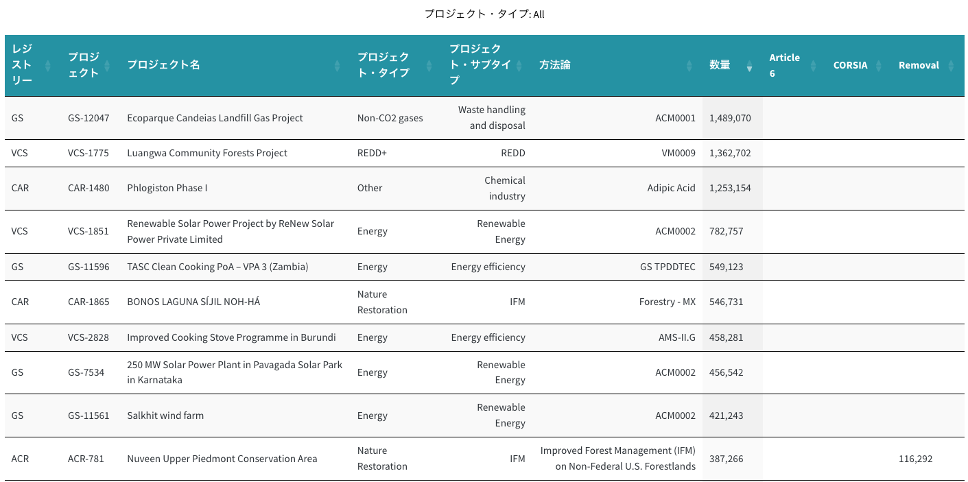 以下は、本対象期間にクレジットが発行されたプロジェクトの上位10件です。