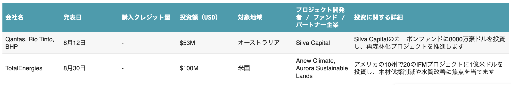 8月には、自然由来のカーボンクレジット創出案件への投資に関して以下2つが報じられました。本セクションでは、自然再生やREDD+への投資のみを取り上げています。CCSなどその他のプロジェクトは含まれていません。