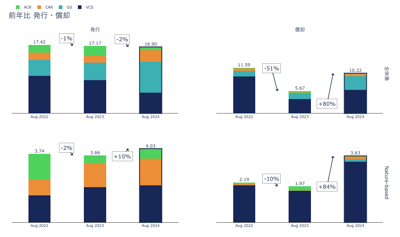 - 留意事項: 償却した企業について、レジストリーに対して実名での登録は義務付けらておらず、正確性は保証できない旨ご了承ください。また、レジストリーへの反映には遅れがありますので、今後も本対象期間中について案件の増減やステータス変更の可能性があることにご留意ください。本対象期間の発行・償却実績は以下のとおりです(括弧内は前年同月比)。発行量については、VCSの割合がかなり小さくなっており、全体ではGold Standard(GS)が増加、NbSではACR, CARのIFM案件からの発行量が増えています。