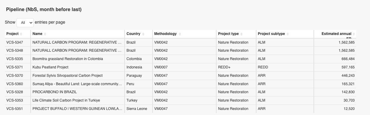 新規の案件パイプラインについては、毎月お伝えしている通りVM0047やVM0042といった、植林・再植林や再生農法の方法論を用いた案件が多く申請されています。今まではあまりARR案件が組成されていなかった、中東のUAEのような場所での案件も申請されています。