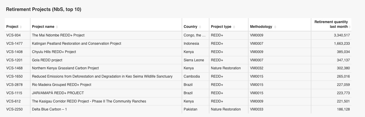 本対象期間に最も多く償却されたトップ10の自然由来プロジェクトの一覧は以下の通りです。