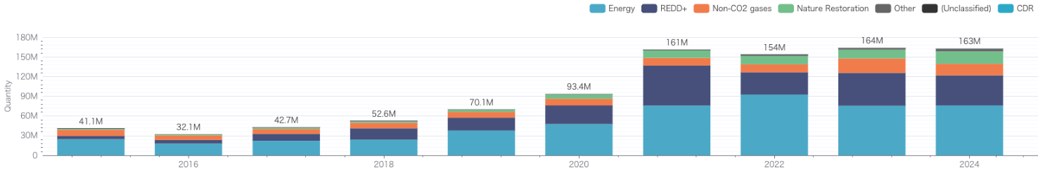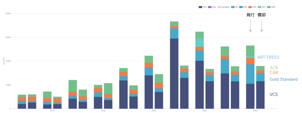2024年1年間の償却量は163 M tCO2(2023年とほぼ同等水準)、発行量は265M tCO2でした(2025/1/7時点での各レジストリー登録データに基づく)。市場全体としては、依然として発行が償却を上回る状況が続いています。