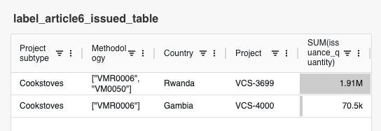 9月は、ルワンダとガンビアのクックストーブ案件に対してArticle 6ラベルが発行されています。これまでの発行実績を見ると、同ルワンダのクックストーブ案件(VCS-3699)が全体の約2割を占めており、ルワンダのクックストーブ案件全体は8割以上を占めています。この後に取り上げるCORSIAラベルも同様ですが、少数の案件が発行量の多くを占めるという特徴があります。