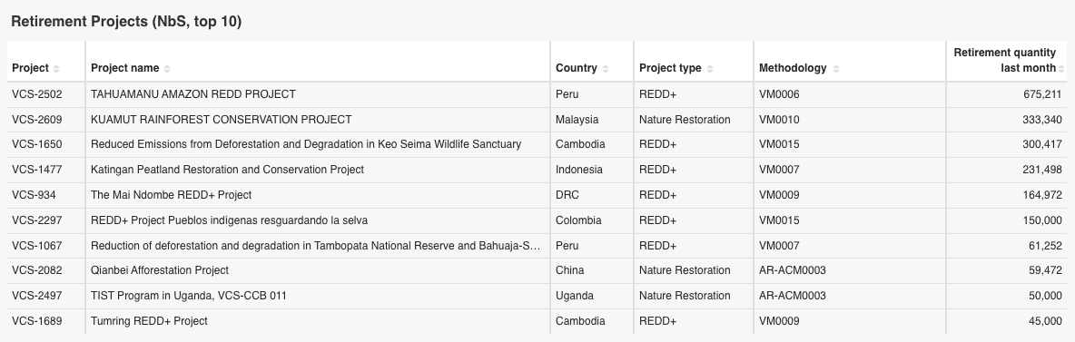 一番償却が大きかったのは、ペルのREDD案件(VCS-2502)で、67万ユニットを超える償却が確認されました。同案件では、今年初めてクレジットが償却されましたが、前回の償却は2024年6月に行われ、80万ユニットを超える量が償却されていました。