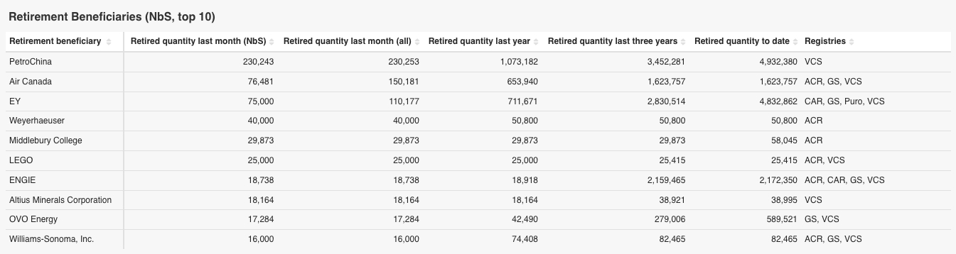 最も多くを償却した企業はPetroChinaであり、その数量は23万ユニットでした。同社はこれまで、REDDおよび自然再生案件に累計484万ユニットを償却しています。その中には、インドネシアの大規模プロジェクトであるKatingan案件(VCS-1477)も含まれています。