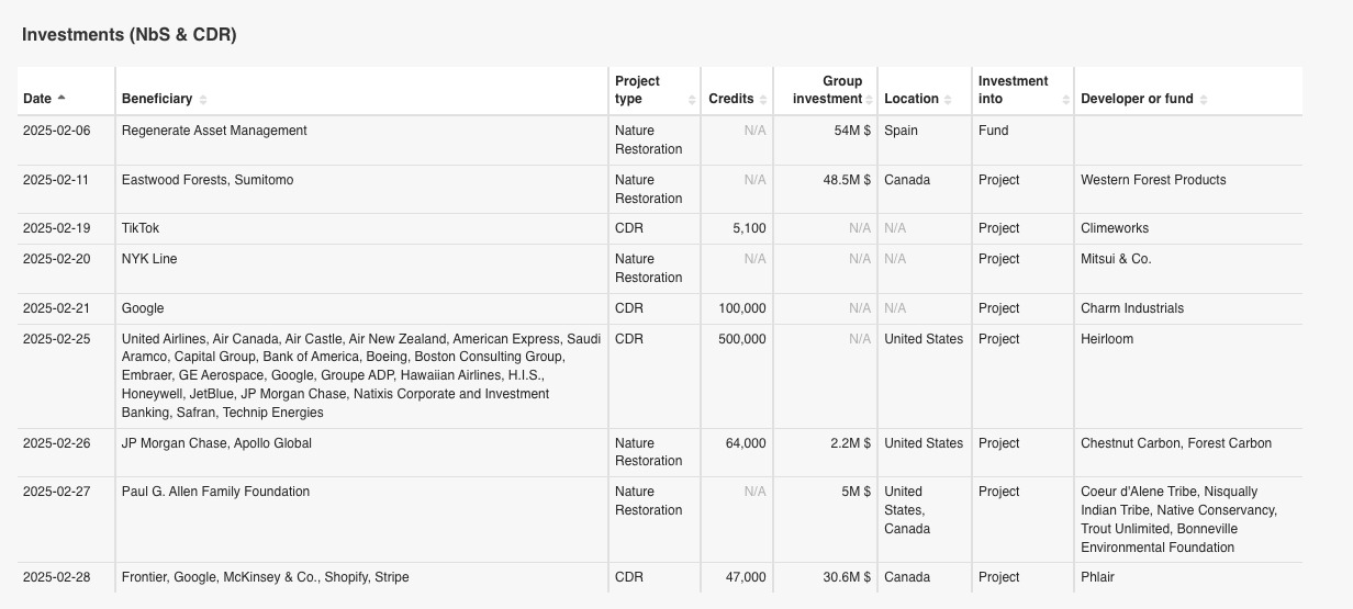 - 留意事項: 自然再生やREDD+、及び、自然由来系のCDR案件に対する投資を取り上げています。また、「クレジット量」や「投資額」については、今後の想定値である場合があります。2月には、自然由来とCDRのプロジェクトへの重要な投資が9件ありました。