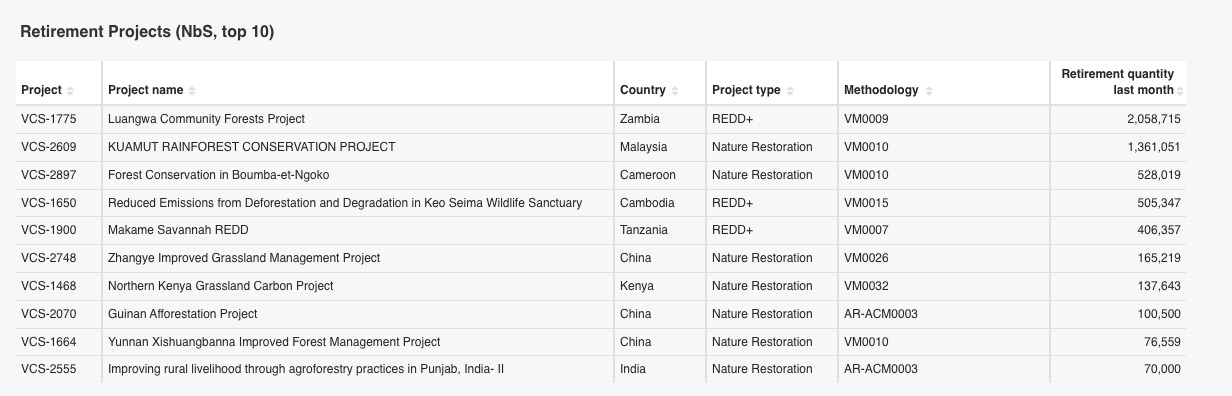 本対象期間に最も多く償却されたトップ10の自然由来プロジェクトの一覧は以下の通りです。