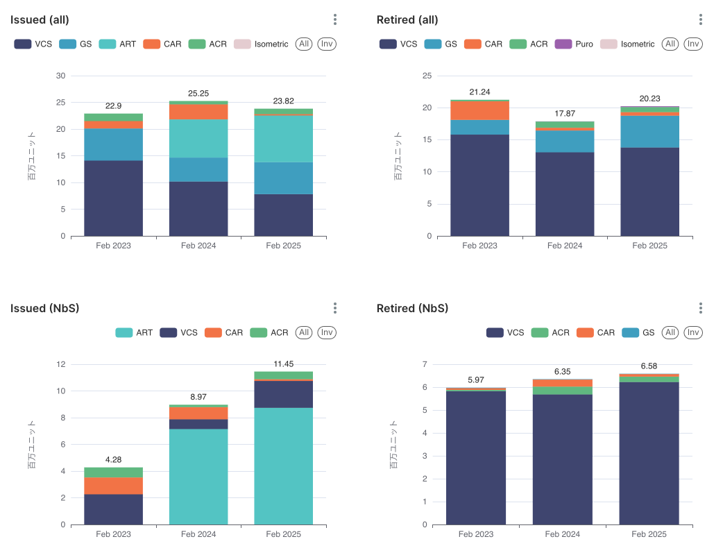 クレジット発行に関し、2月の全体発行量は2,380万ユニットとなり、前年同月比で大きな変化はありませんが、自然由来のクレジット発行量は毎年増加しています。中でも、ARTレジストリによる発行が大きな部分を占めているのが特徴です。