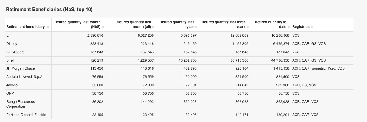 対象期間中に自然由来プロジェクトのクレジットを償却した上位10社は以下の通りです。