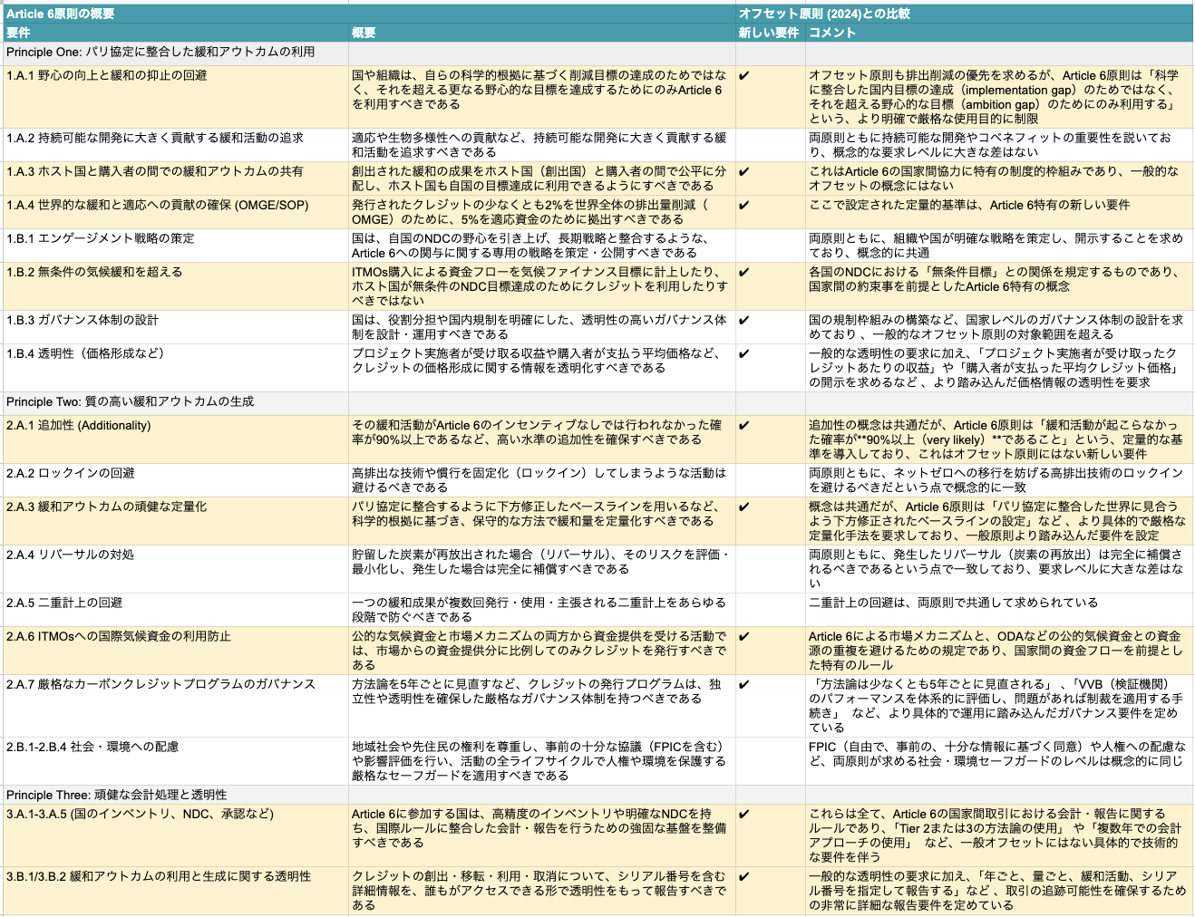今回新たに発表されたArticle 6原則は、オフセット原則の考え方を土台としながら、6条という国家間のメカニズム特有の課題に対応するために設計されています。オフセット原則の4つ基準と類似の内容が言及されているのは”1. 自社排出量の削減を優先する”についてで、それ以外の部分はArticle 6という国際的な取引に関わるルールに焦点が当てられています。