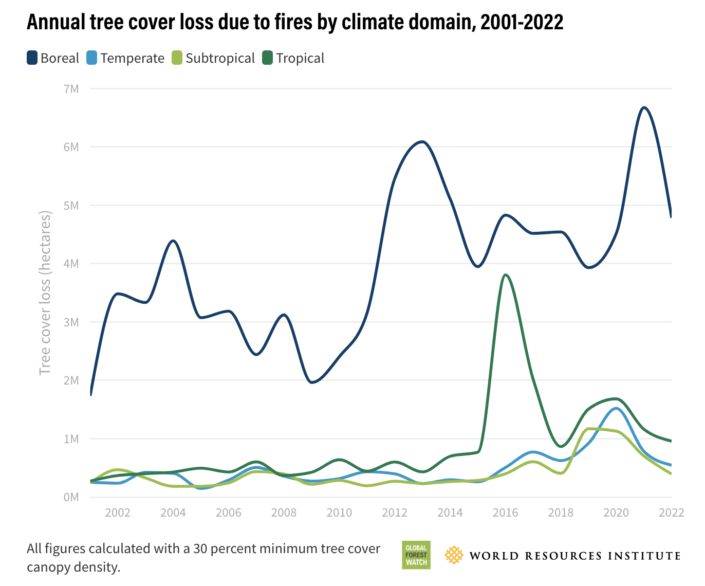最近もWRI(世界資源研究所)が、メリーランド大学の研究に基づき、森林火災に関するレポートを出しました。2021、2022年にそれぞれ930万、660万ヘクタールの森林が消失し、特にカナダやロシアなど北方林(Boreal forest)での森林火災が増加しています。