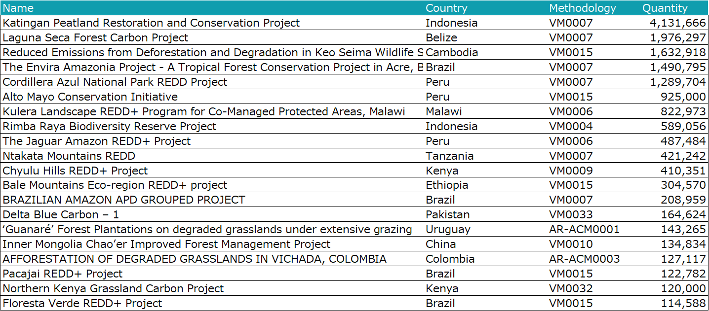 2023年12月にリタイアされたプロジェクトの一覧(AFOLUセクターのみ)です。上位20件のプロジェクトでリタイアメント全体の6割を占めています。国別ではIndonesiaが最大(27%)で、その後をPeru(17%)、Brazil(13%)、Belize(11%)、Cambodia(10%)が続いています。