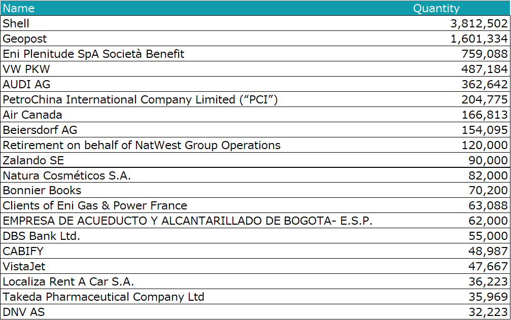 Verra AFOLUセクターのカーボンクレジットをリタイアした企業のTOP 20社は以下の通りです。先月に引き続き、Shellの償却量が非常に大きいです。2位に出ているGeopost社はフランスを中心に事業展開している陸運・個別配送を担う事業者です。同社はSBTiの指針に基づき、2040年までに2020年度比90%の排出量削減を目指し、残余排出量は植林等の吸収系カーボンクレジットの購入で中和することを公表しています。今回の償却量である160万トンは2022年度の排出量である180万トン(スコープ1-3合計)に近い規模となっています。推測ですが、2023年度の残余排出量をすべて中和した結果、160万トンの償却になったのかもしれません。