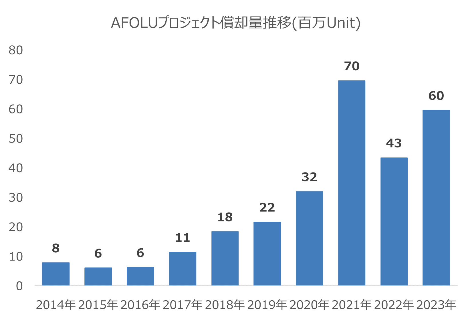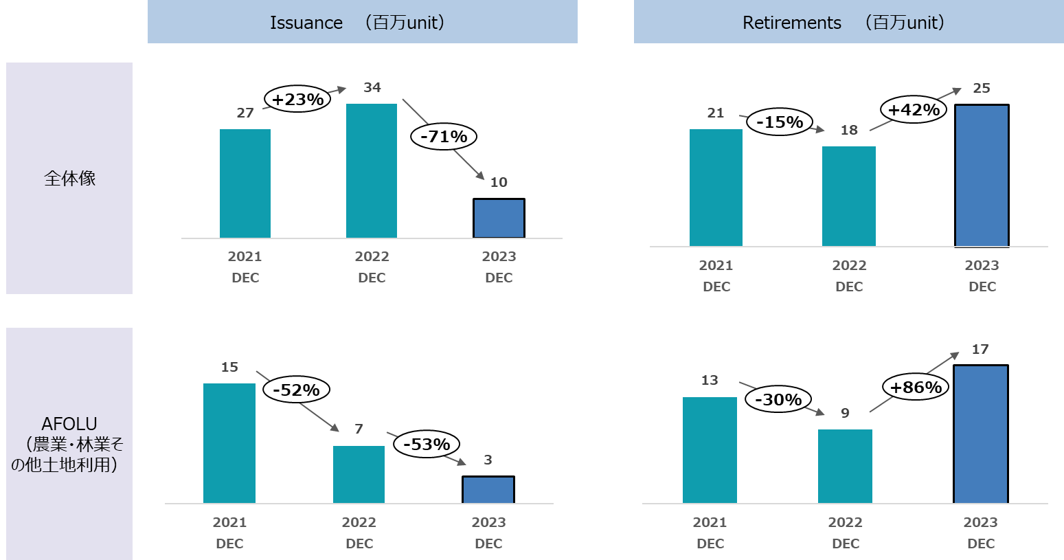過去10年間のAFOLUプロジェクトのリタイア量推移です。2023年は、59,519,223ユニットであり、前年比+37%となりました。2021年の水準ほどではないものの、リタイア量は増加に転じています。