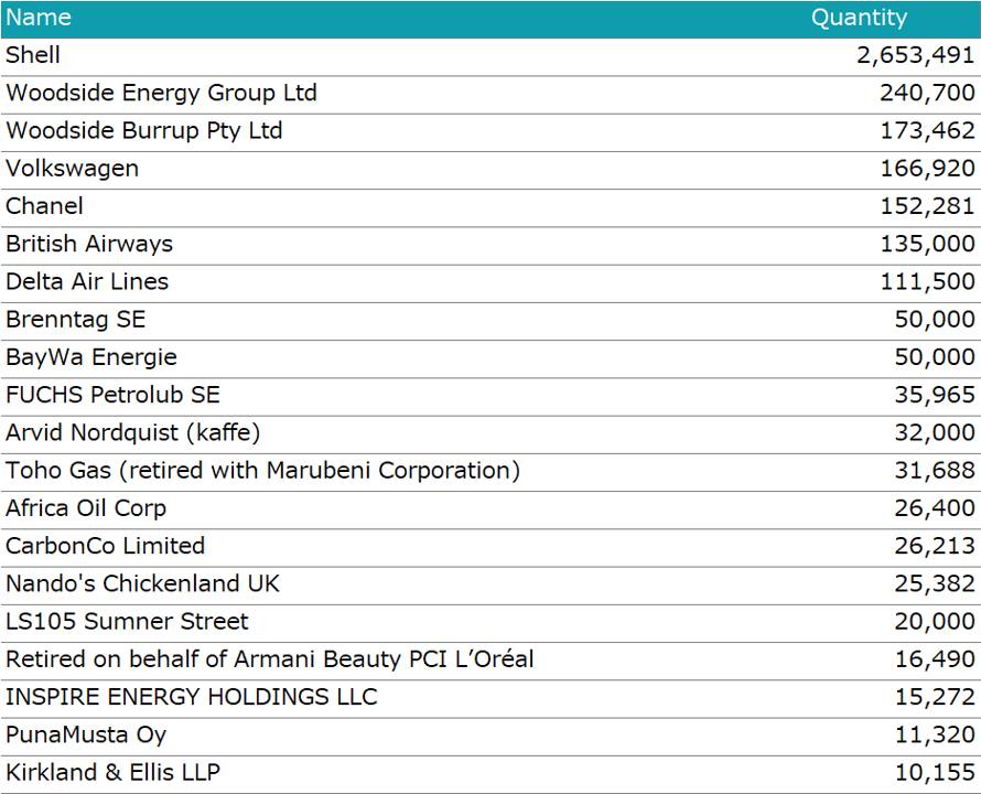 Verra AFOLUセクターのカーボンクレジットをリタイアした企業のTOP 20社は以下の通りです。Shellは過去数年を見ると毎月2月に年間を通じて最大量のクレジットをリタイアしています。このため、Shellのリタイアメント量は2月リタイアメント総量の3割超を占めています。Oil Industry、Automotive Industry、Airline、Chemical、Consumer業界がリタイアをしています。
