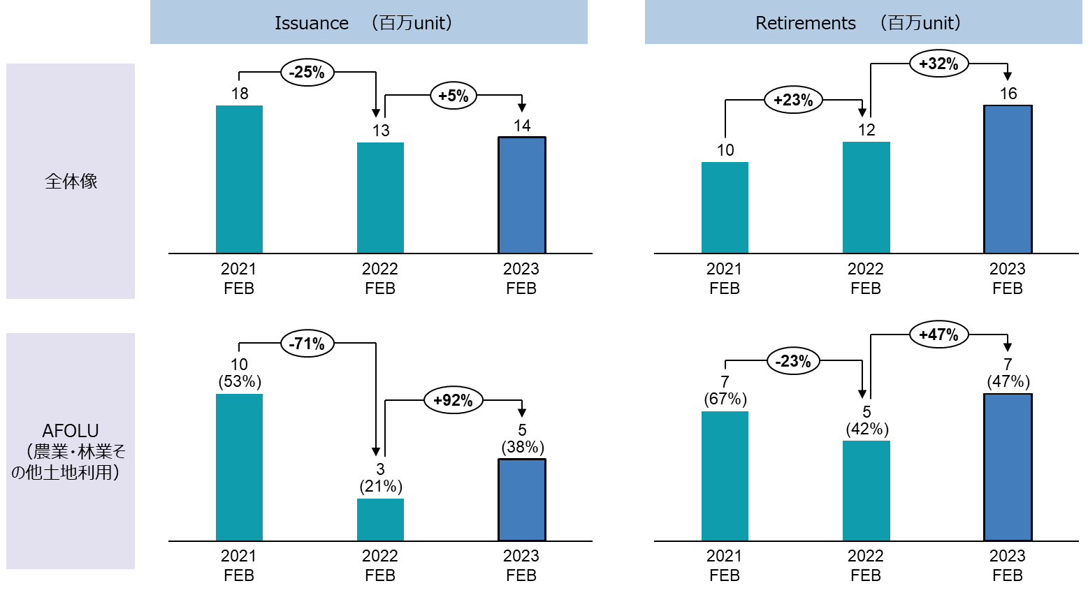 2023年2月はVerraボランタリーカーボンクレジットでは14,151,988ユニットが新たに発行され、15,805,041ユニットがリタイアされました。それぞれ前年同月比+5%、+32%と成長しています。