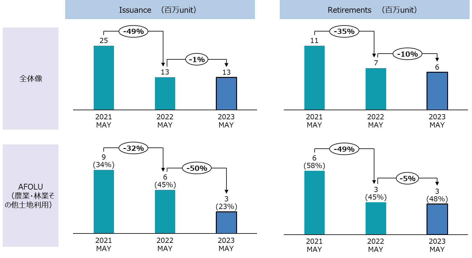 2023年5月はVerraボランタリーカーボンクレジットでは12,844,883ユニットが新たに発行され、6,267,040ユニットがリタイアされました。それぞれ前年同月比-1%、-10%と減少しています。