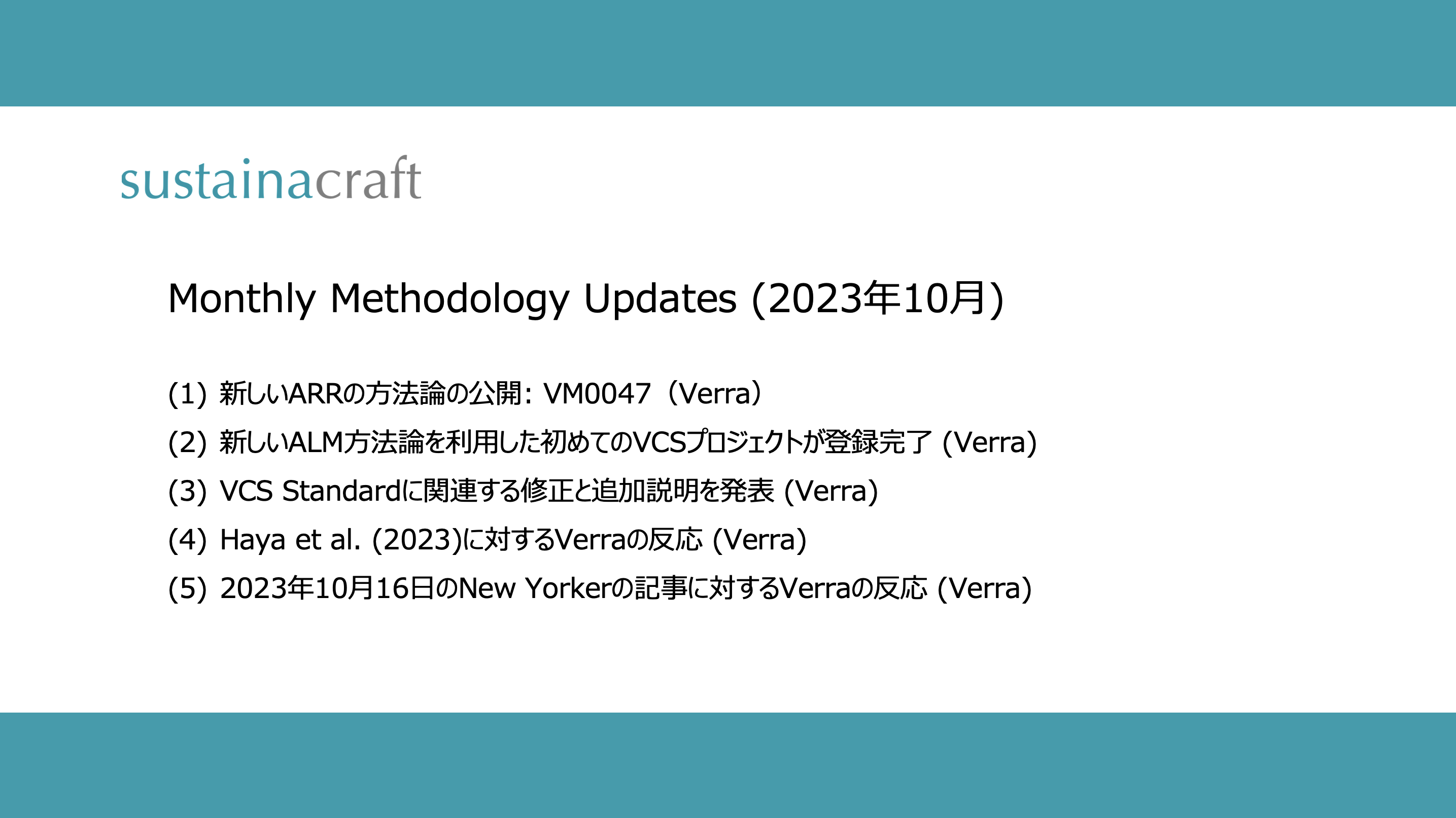 株式会社sustainacraftのニュースレターです。今回はMonthly Methodology Updatesとして、主に2023年10月に発表されたVCSの方法論に関するニュースを中心にお届けします。